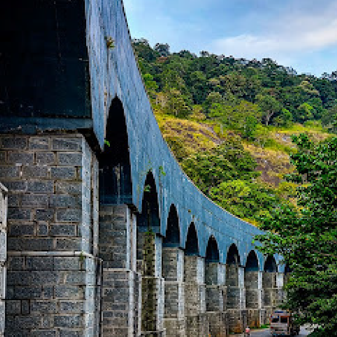 The 13 Arch Bridge in Kerala’s Kollam district is a historic colonial-era railway bridge, known for its 13 stone arches set amid lush green surroundings.
